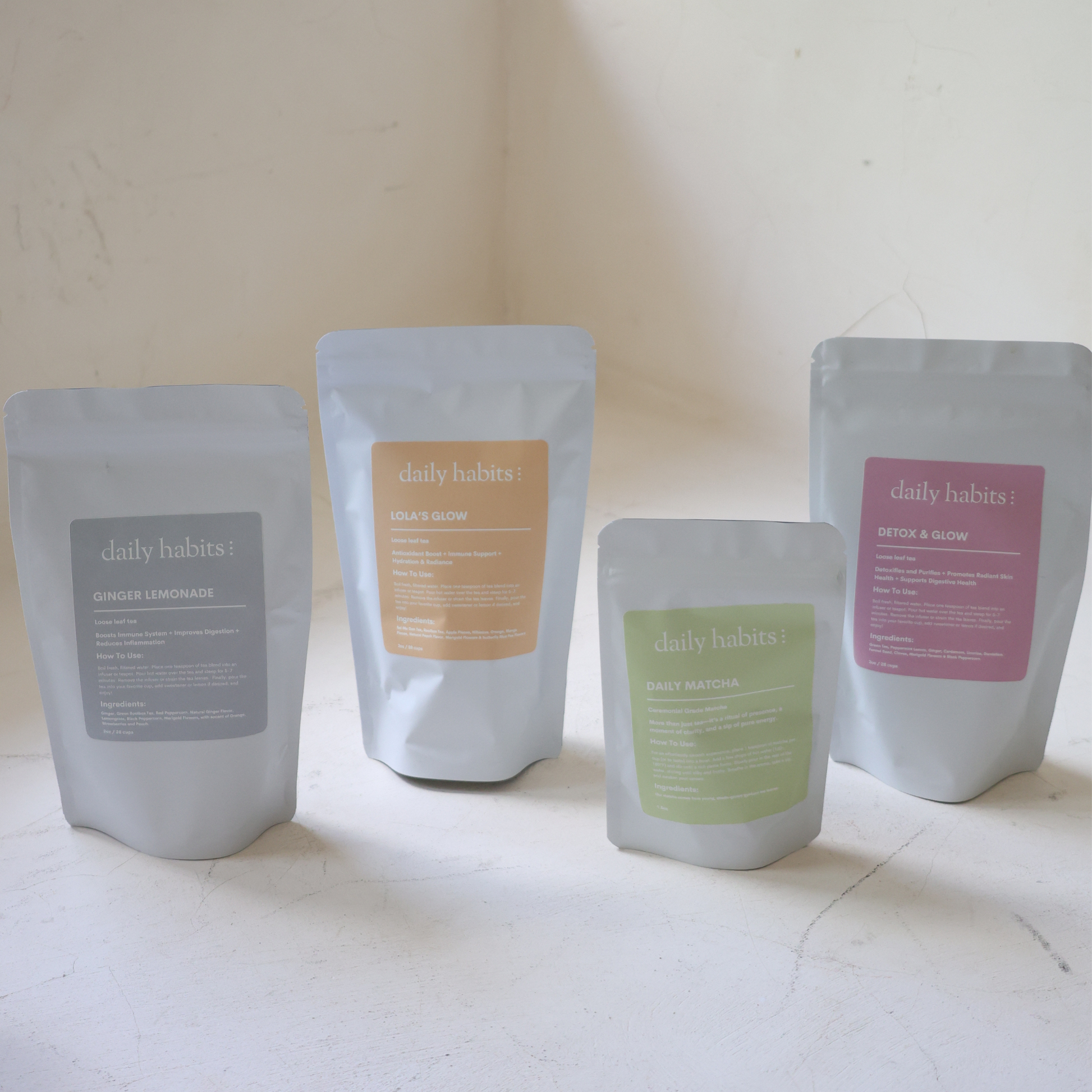 Detox & Glow – A grounding blend of green tea, dandelion, fennel, and warming spices to support detoxification, reduce bloating, and bring balance from within.